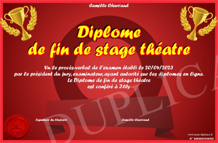Envoyez par email votre Diplôme de fin de stage théatre personalisé