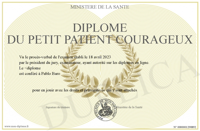 Envoyez par email votre Diplôme du petit patient courageux personalisé