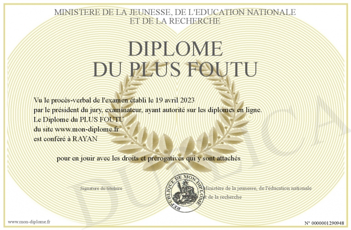 Envoyez par email votre Diplôme du PLUS FOUTU personalisé