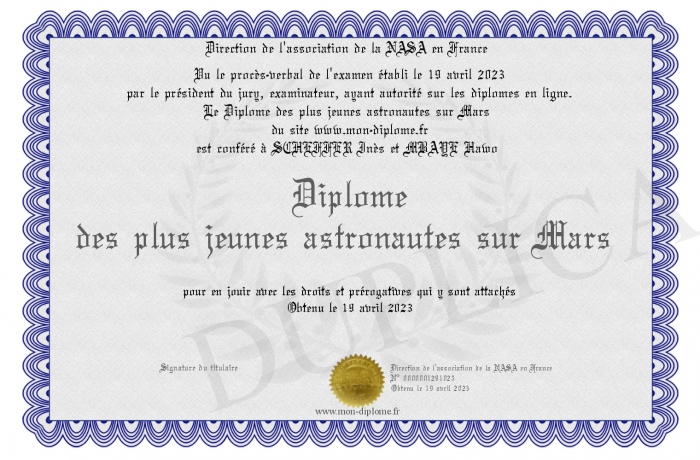 Envoyez par email votre Diplôme des plus jeunes astronautes sur Mars personalisé