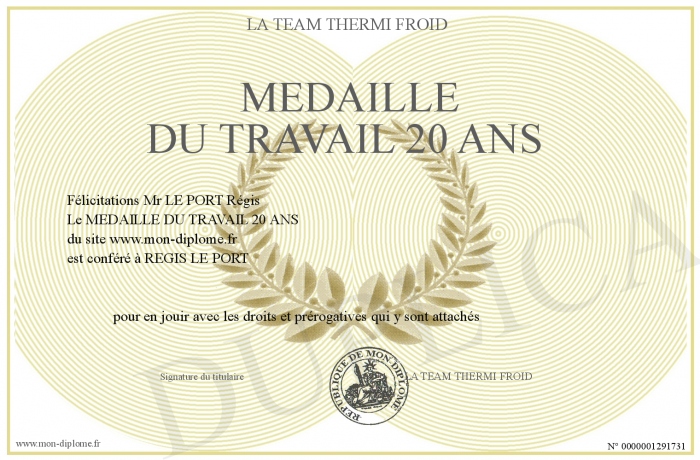 Envoyez par email votre MEDAILLE DU TRAVAIL 20 ANS personalisé