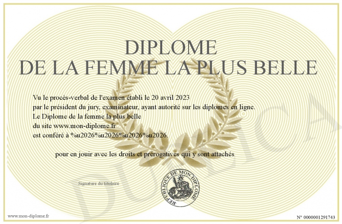Envoyez par email votre Diplôme de la femme la plus belle personalisé