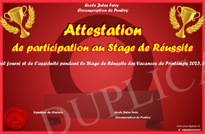 Envoyez par email votre Attestation de participation au Stage de Réussite personalisé