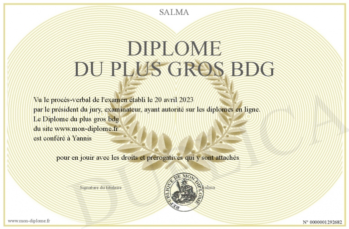 Envoyez par email votre Diplôme du plus gros bdg personalisé