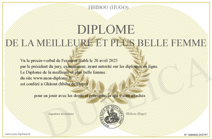 Envoyez par email votre Diplôme de la meilleure et plus belle femme personalisé