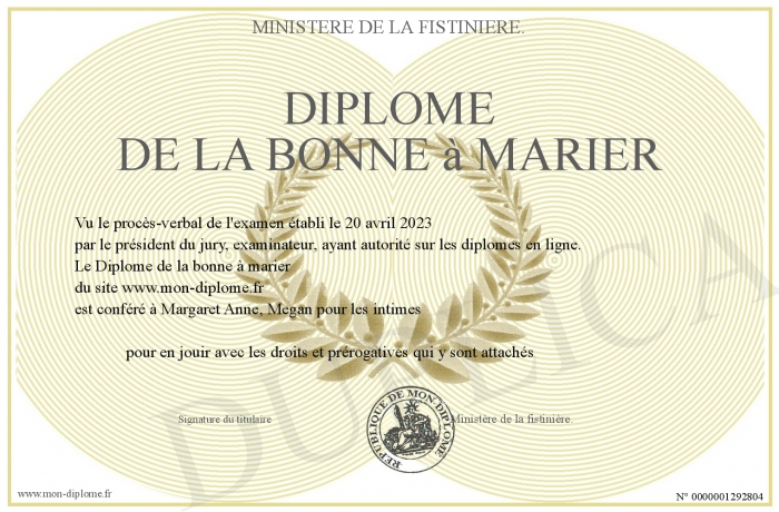 Envoyez par email votre Diplôme de la bonne à marier personalisé