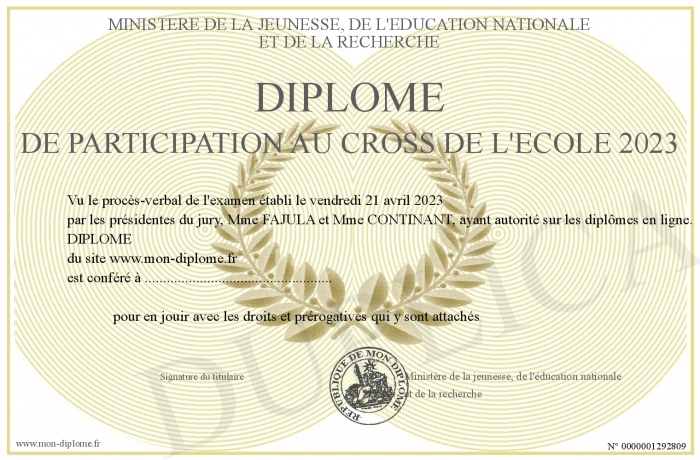 Envoyez par email votre Diplôme de participation au cross de l'école 2023 personalisé