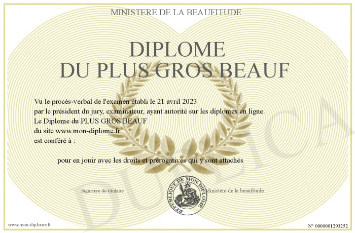 Envoyez par email votre Diplôme du PLUS GROS BEAUF personalisé