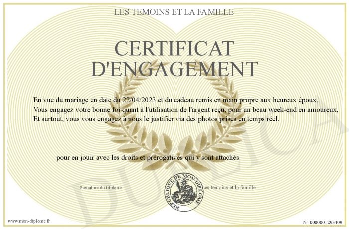 Envoyez par email votre CERTIFICAT D'ENGAGEMENT personalisé