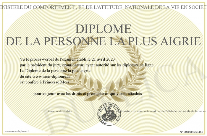 Envoyez par email votre Diplôme de la personne la plus aigrie personalisé