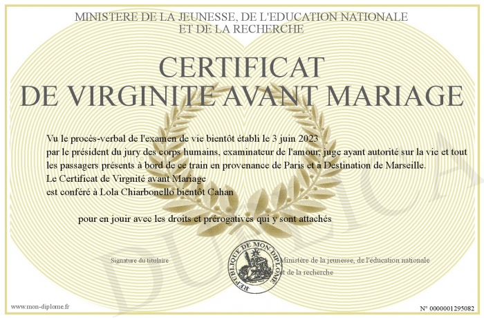 Envoyez par email votre Certificat de Virginité avant Mariage personalisé