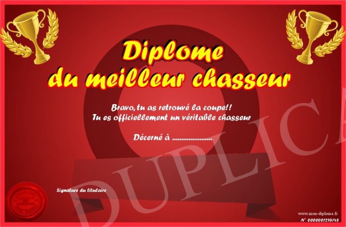 Envoyez par email votre Diplôme du meilleur chasseur personalisé