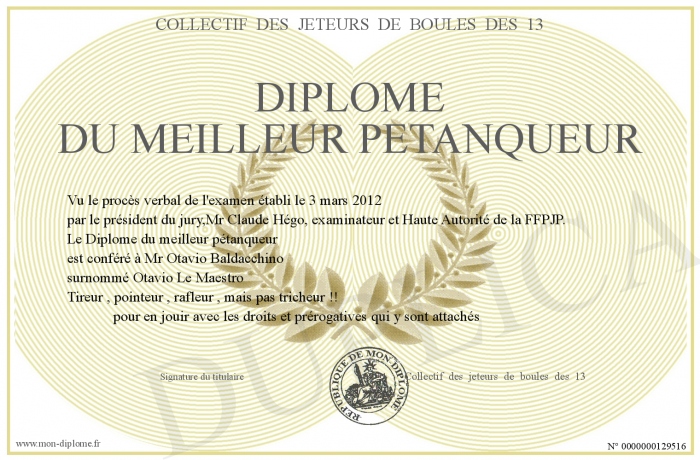 Envoyez par email votre Diplôme du meilleur pétanqueur personalisé