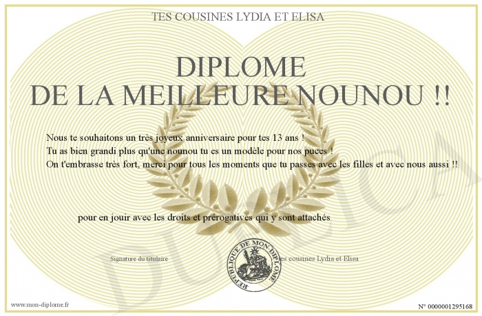 Envoyez par email votre Diplôme de la meilleure Nounou !! personalisé
