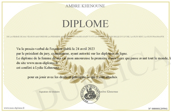 Envoyez par email votre diplôme de la femme de ma vie mon amoureuse la première à mes yeux qui passe avant tout le monde, la plus belle du lycée, la plus sexy, la plus fragrante personalisé