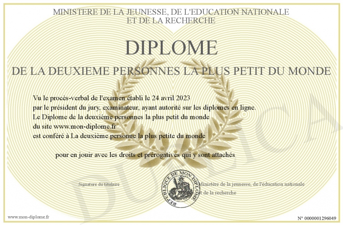 Envoyez par email votre Diplôme de la deuxième personnes la plus petit du monde personalisé