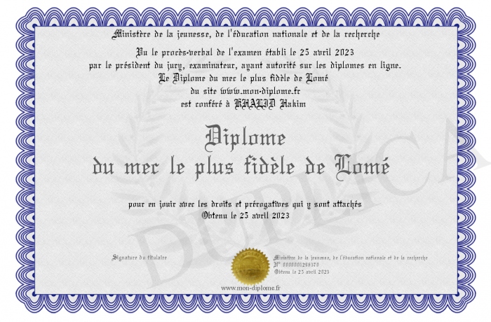 Envoyez par email votre Diplôme du mec le plus fidèle de Lomé personalisé