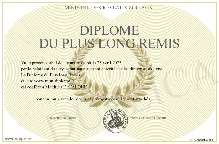 Envoyez par email votre Diplôme du Plus long Remis personalisé
