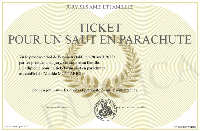 Envoyez par email votre TICKET POUR UN SAUT EN PARACHUTE personalisé