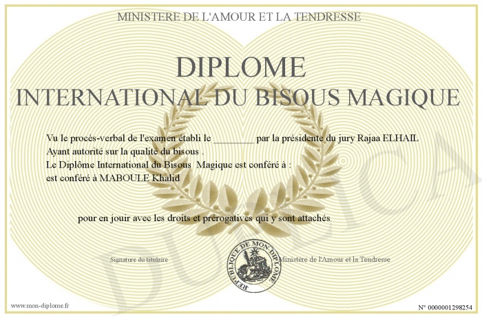 Envoyez par email votre DIPLOME INTERNATIONAL DU BISOUS MAGIQUE personalisé