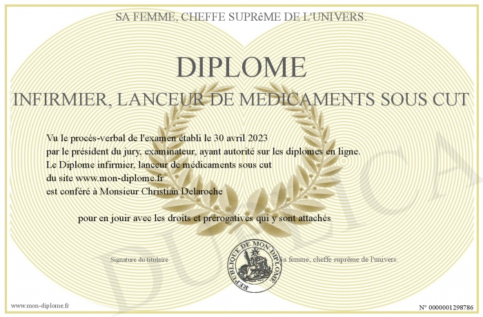 Envoyez par email votre Diplôme infirmier, lanceur de médicaments sous cut personalisé