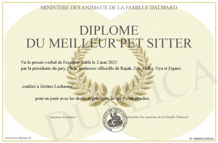 Envoyez par email votre Diplôme du meilleur pet sitter personalisé
