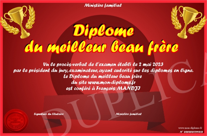 Envoyez par email votre Diplôme du meilleur beau frère personalisé