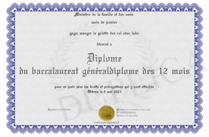 Envoyez par email votre Diplôme du baccalaureat généraldiplome des 12 mois personalisé