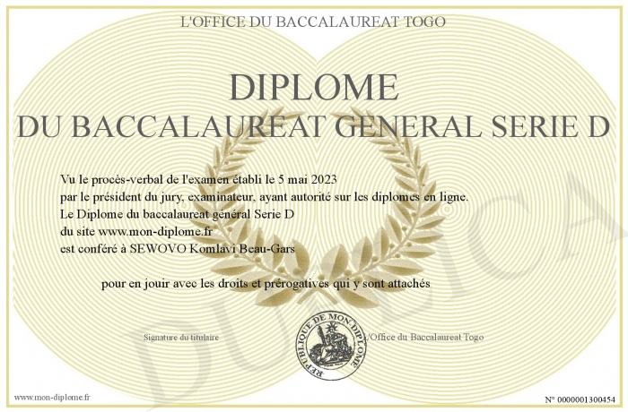 Envoyez par email votre Diplôme du baccalaureat général Serie D personalisé