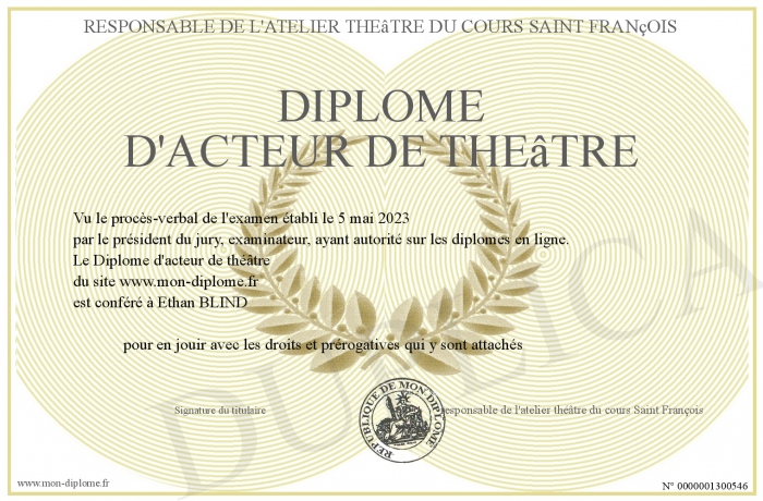 Envoyez par email votre Diplôme d'acteur de théâtre personalisé