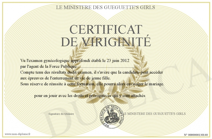 Envoyez par email votre CERTIFICAT DE VIRIGINITÉ personalisé