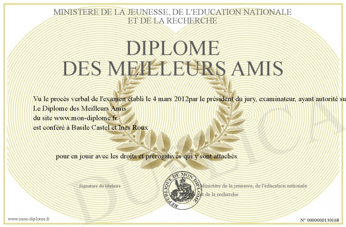 Envoyez par email votre Diplome des Meilleurs Amis personalisé