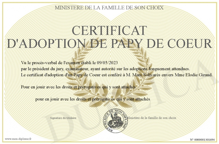 Envoyez par email votre Certificat d'adoption de Papy de Coeur personalisé