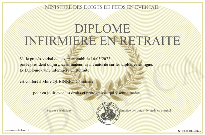 Envoyez par email votre Diplôme Infirmière en Retraite personalisé