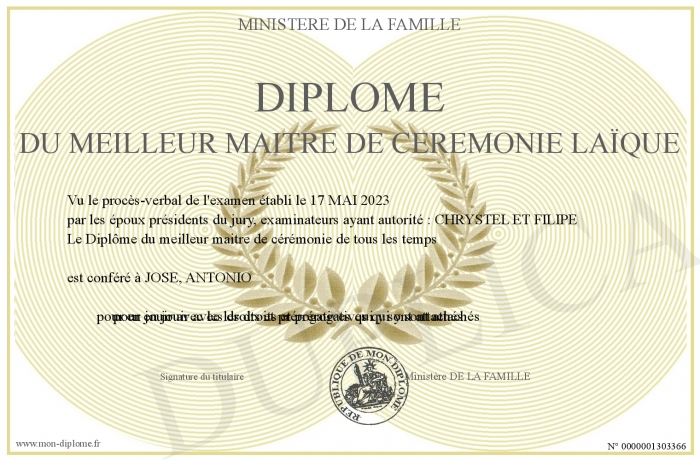 Envoyez par email votre DIPLOME DU MEILLEUR MAITRE DE CEREMONIE LAÏQUE personalisé