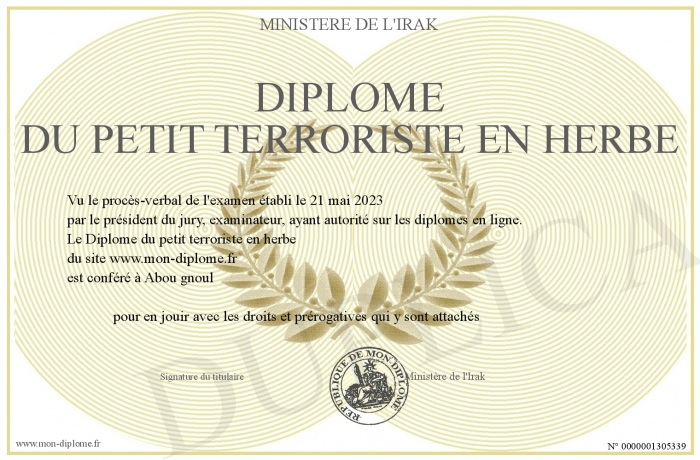 Envoyez par email votre Diplôme du petit terroriste en herbe personalisé