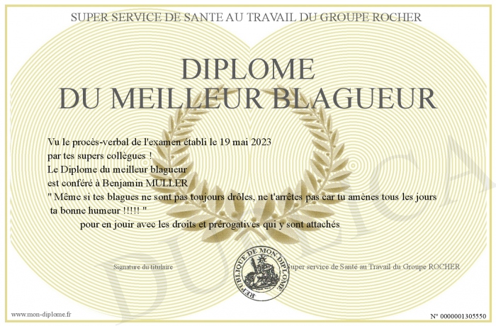 Envoyez par email votre Diplôme du meilleur blagueur personalisé