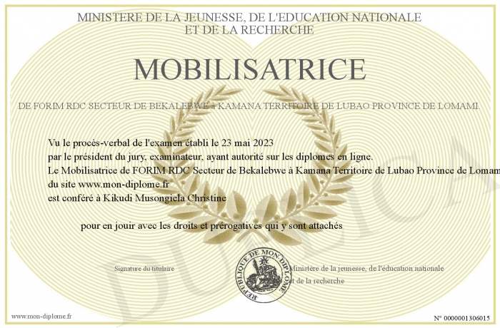 Envoyez par email votre Mobilisatrice de FORIM RDC Secteur de Bekalebwe à Kamana Territoire de Lubao Province de Lomami. personalisé