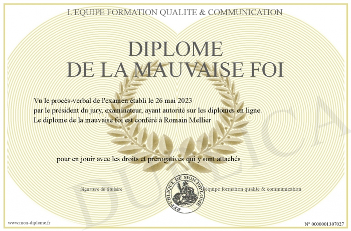 Envoyez par email votre diplôme de la mauvaise foi personalisé