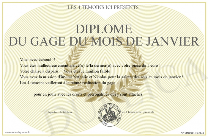 Envoyez par email votre Diplôme du gage du mois de Janvier personalisé