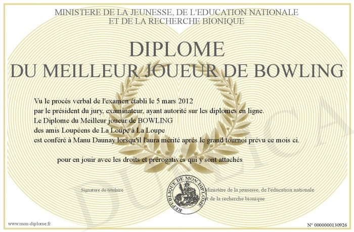 Envoyez par email votre Diplôme du Meilleur joueur de BOWLING personalisé