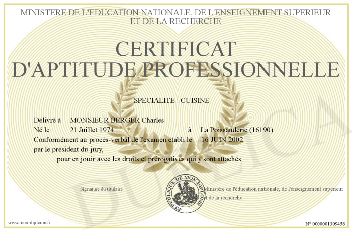 Envoyez par email votre Certificat d'Aptitude Professionnelle personalisé