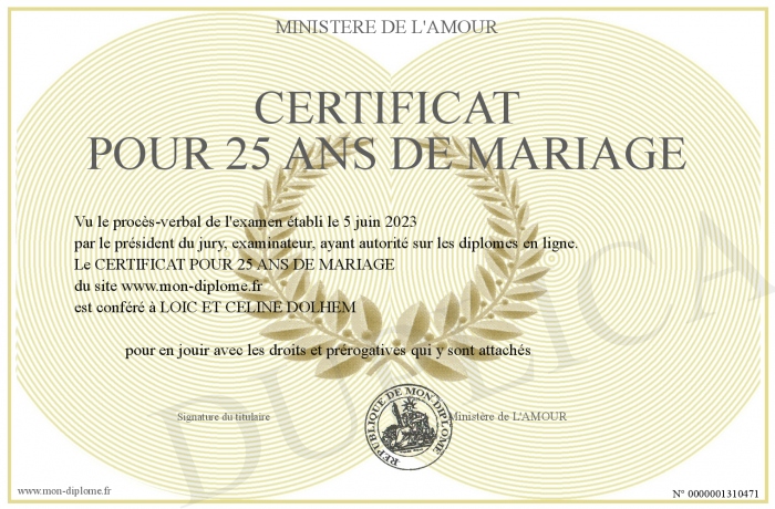 Envoyez par email votre CERTIFICAT POUR 25 ANS DE MARIAGE personalisé