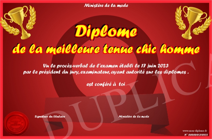 Envoyez par email votre Diplôme de la meilleure tenue chic homme personalisé