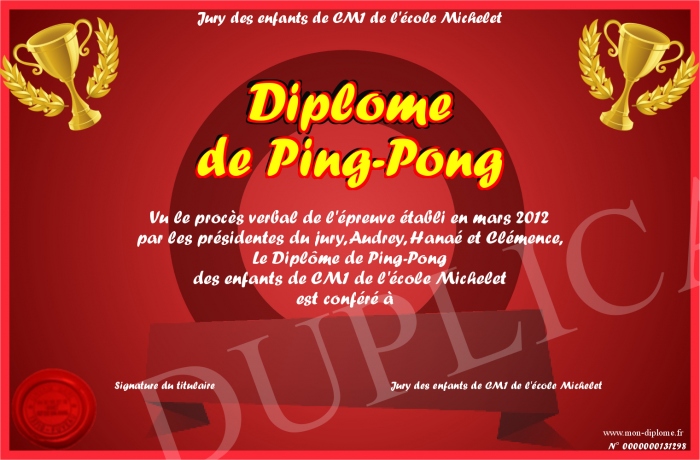 Envoyez par email votre Diplôme de Ping-Pong personalisé