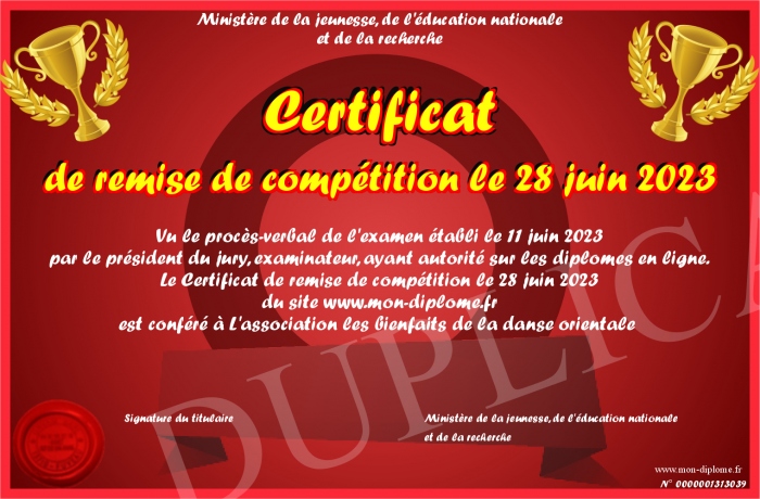 Envoyez par email votre Certificat de remise de compétition le 28 juin 2023 personalisé