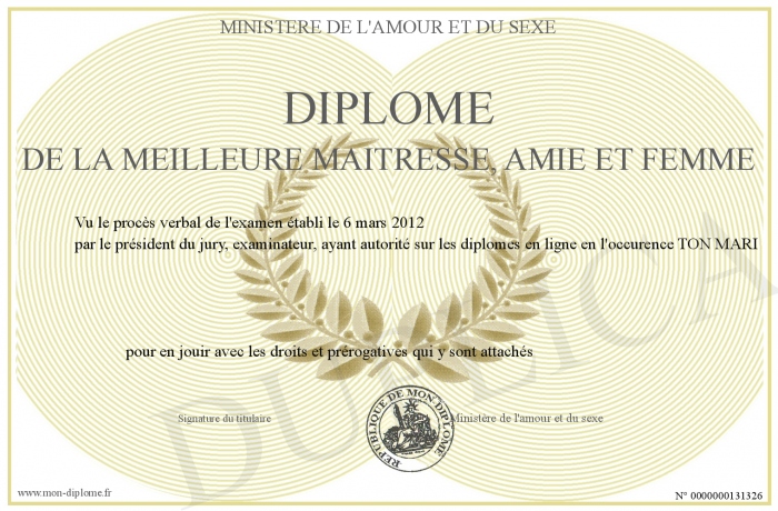 Envoyez par email votre Diplome de la meilleure Maitresse, amie et femme personalisé