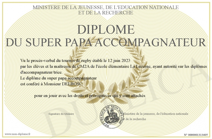 Envoyez par email votre Diplôme du super papa accompagnateur personalisé