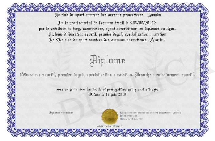 Envoyez par email votre Diplôme d'éducateur sportif, premier degré, spécialisation : natation. Branche : entraînement sportif. personalisé