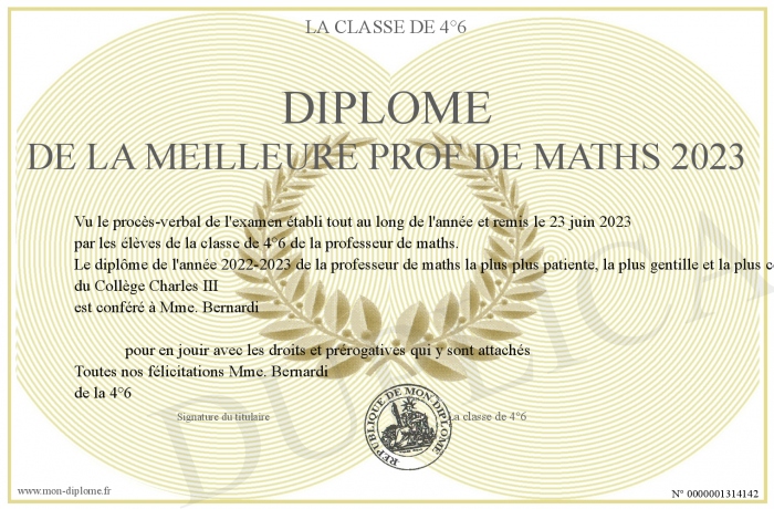 Envoyez par email votre Diplôme de la meilleure prof de maths 2023 personalisé